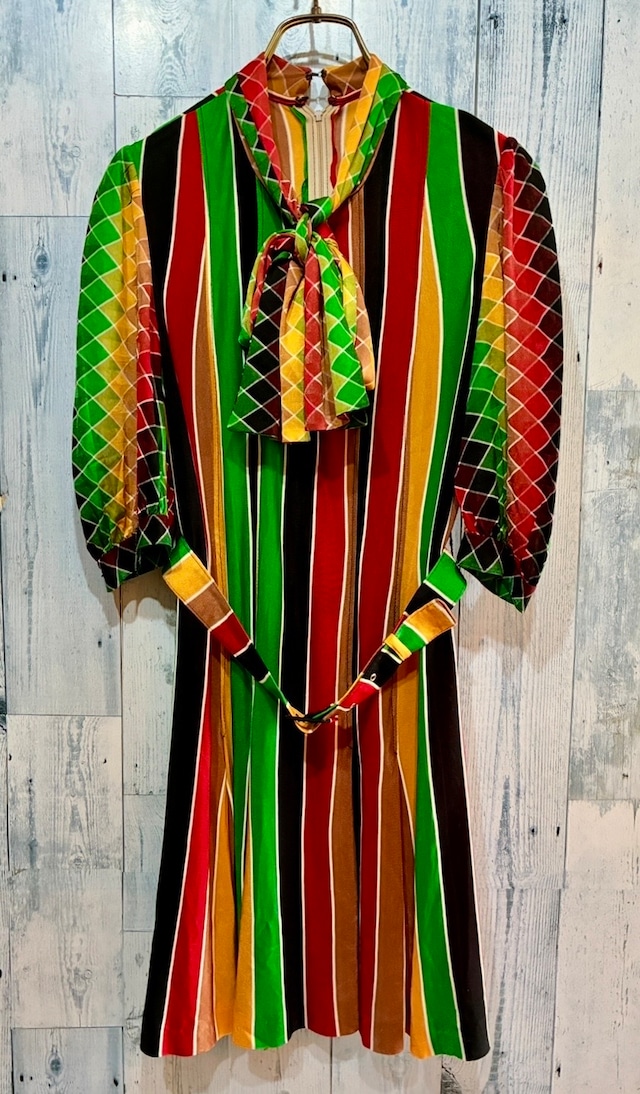 ヴィンテージ リボン ベルト付 ストライプ ワンピース 60s70s