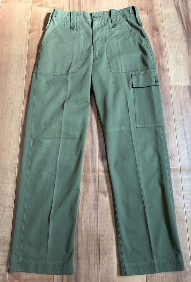 ビンテージ イギリス軍 ミリタリーパンツです サイズ表記 不明 ウエスト平置き直線約44センチ 股下約73センチ 裾幅約21センチ 多少の誤差はご容赦ください 多少の汚れ、使用感ありますが 大きなダメージはありません。 中古品にご理解のある方のみ ノークレームノーリターンでお願い致します