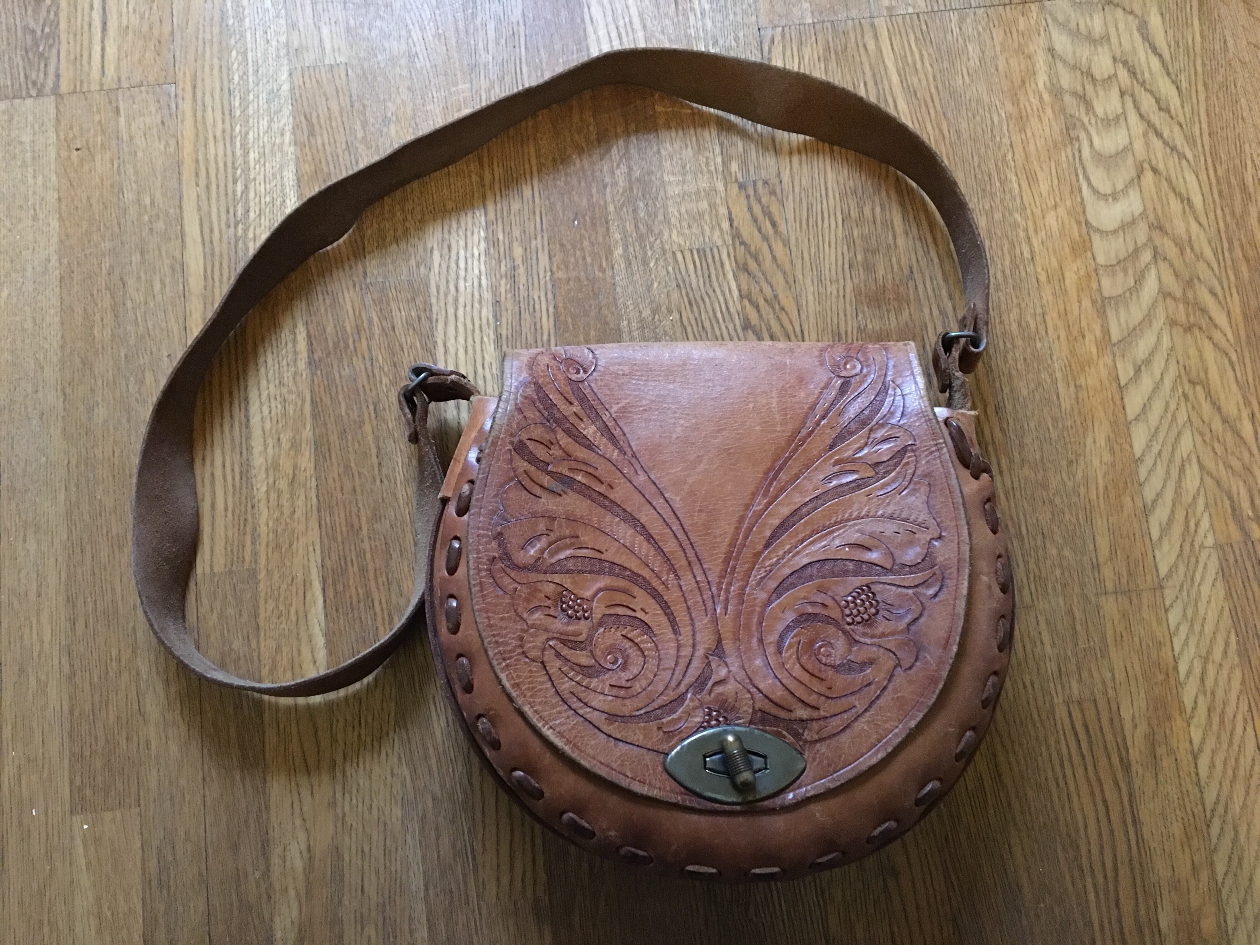 US ビンテージ カービング レザー ショルダー バッグ / ヒッピー 60s 70s OLD