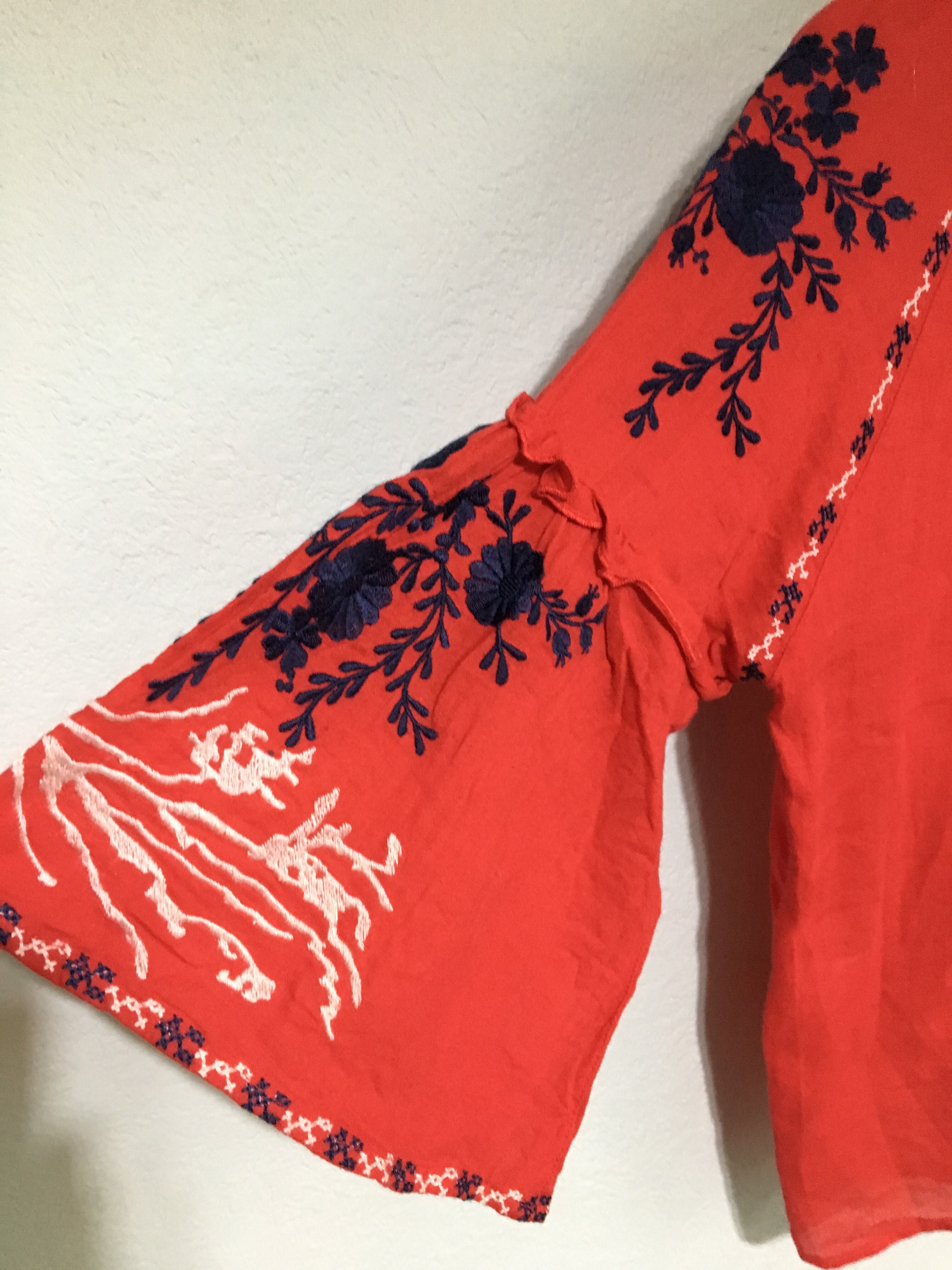 刺繍 前明き ベルスリーブシャツ レッド 赤系 チュニック / ヒッピー ボヘミアン