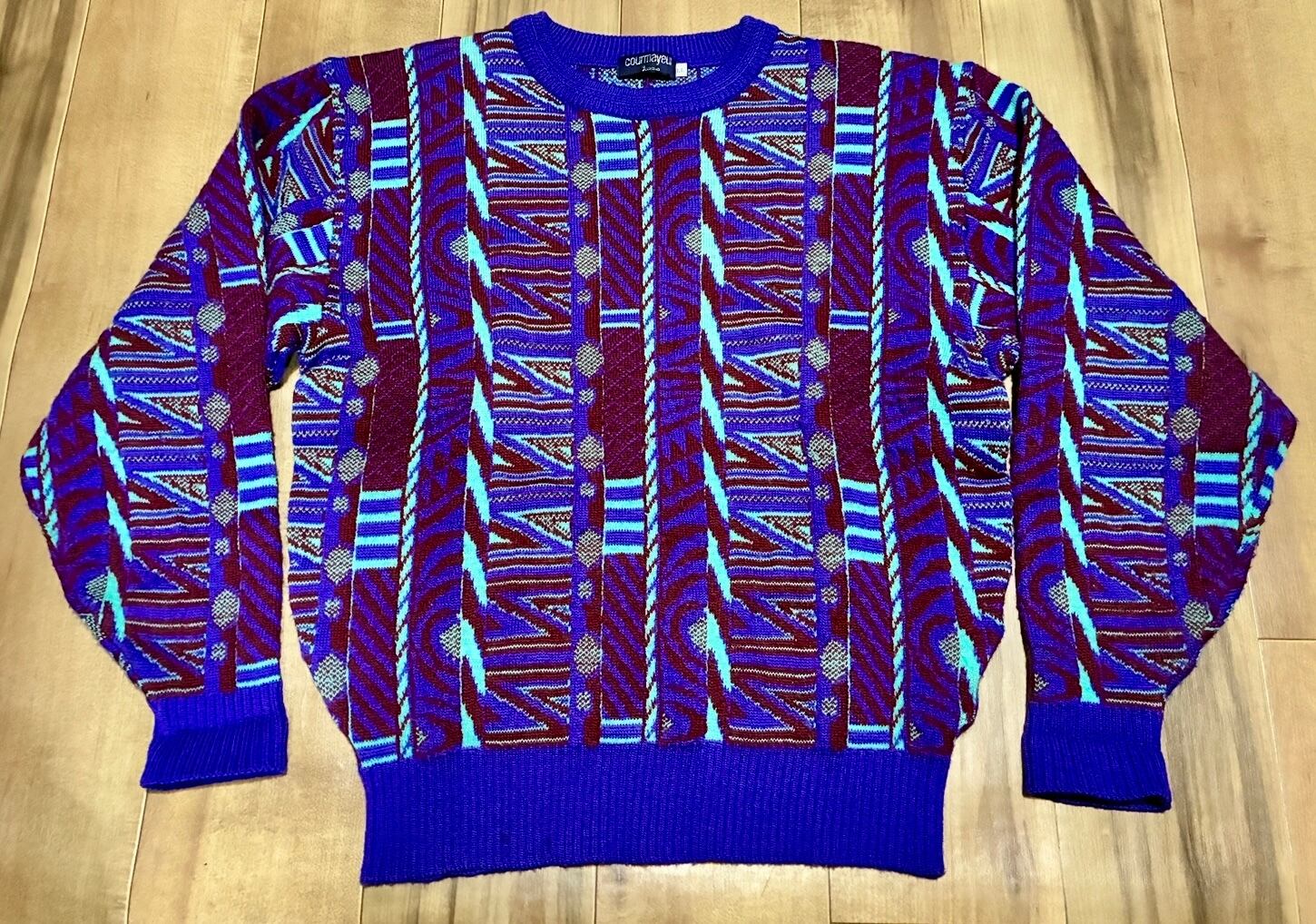 ヴィンテージ ブルーパープル系幾何学アート柄ニットセーターLL