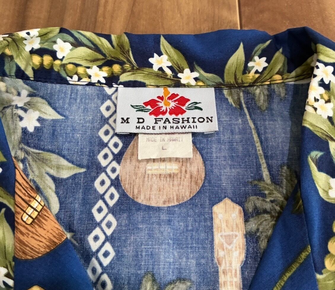 ハワイ製ヴィンテージ MD FASHION ウクレレ柄アロハシャツ ブルー L