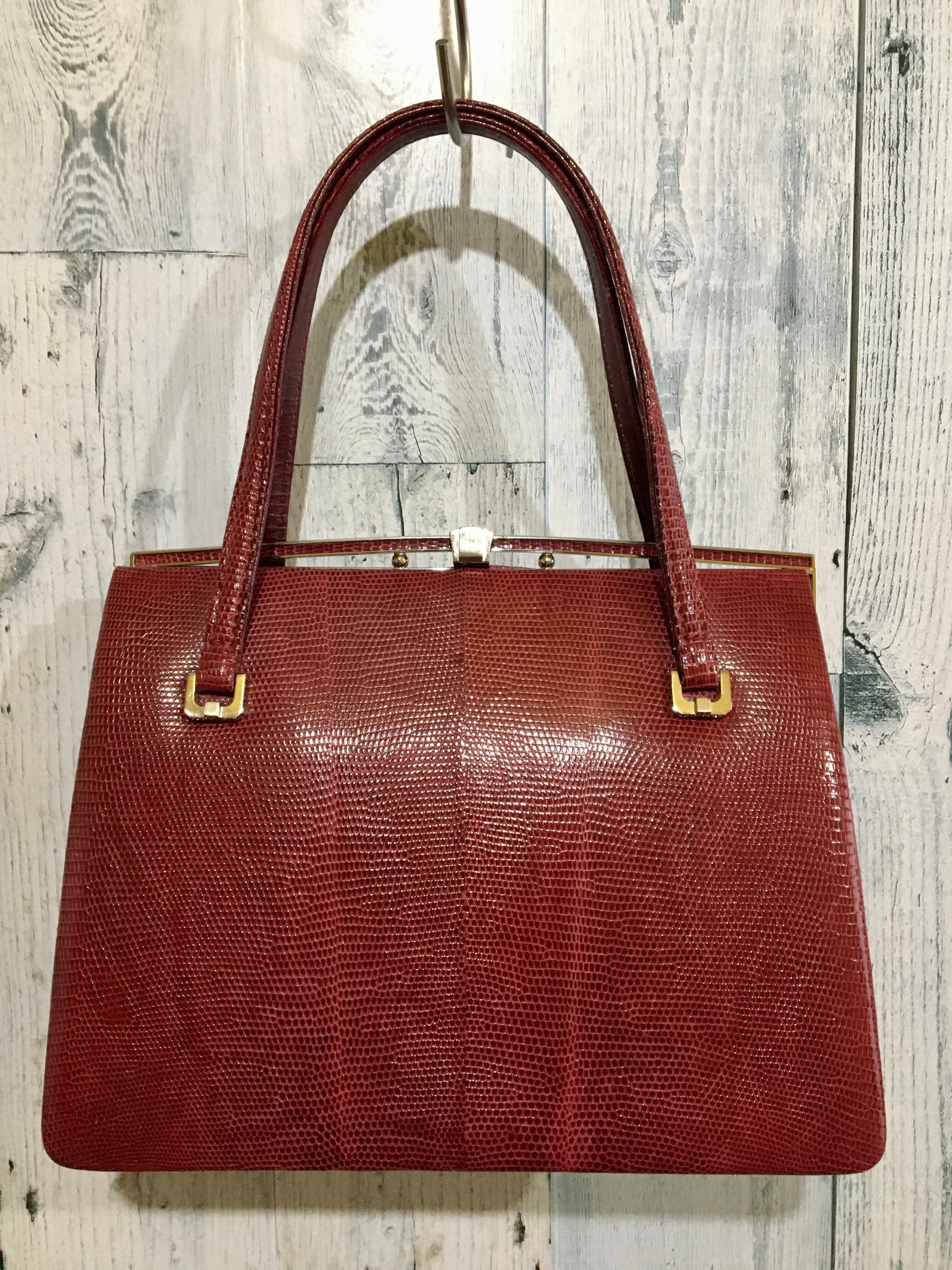 ビンテージ リザードスキン トカゲ ハンドバッグ ワイン ボルドー系カラー