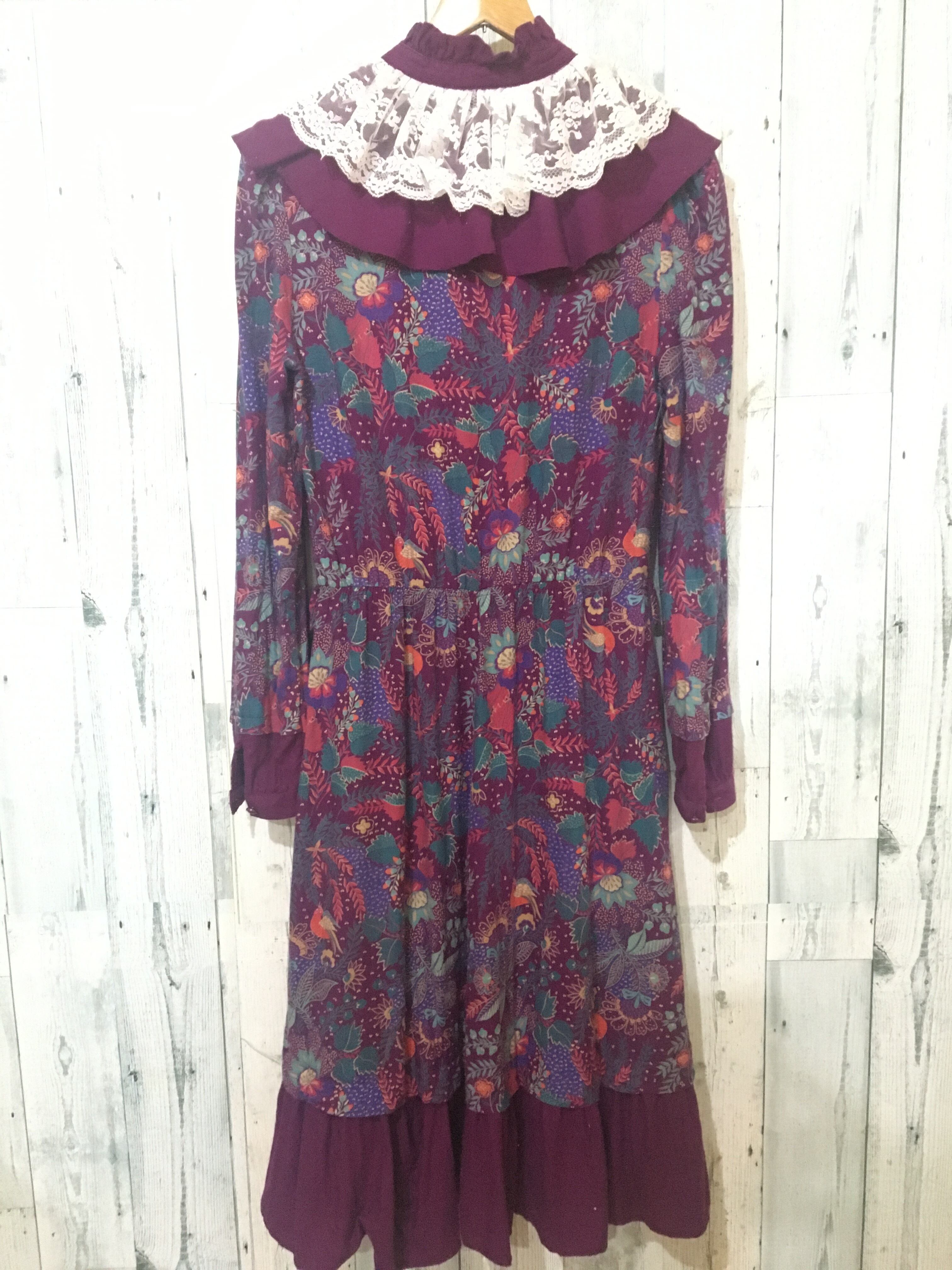ルーマニア製 レース付 花柄ワンピース 紫系 ボヘミアン ヒッピー