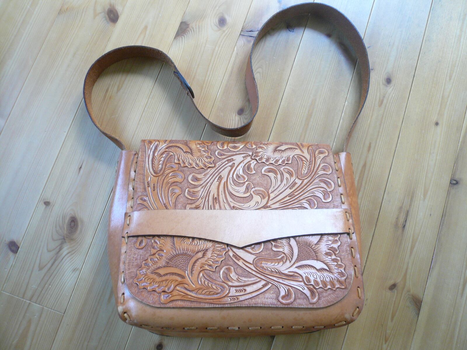 上質サドルレザー使用 カービング模様入 大型ショルダーバッグ