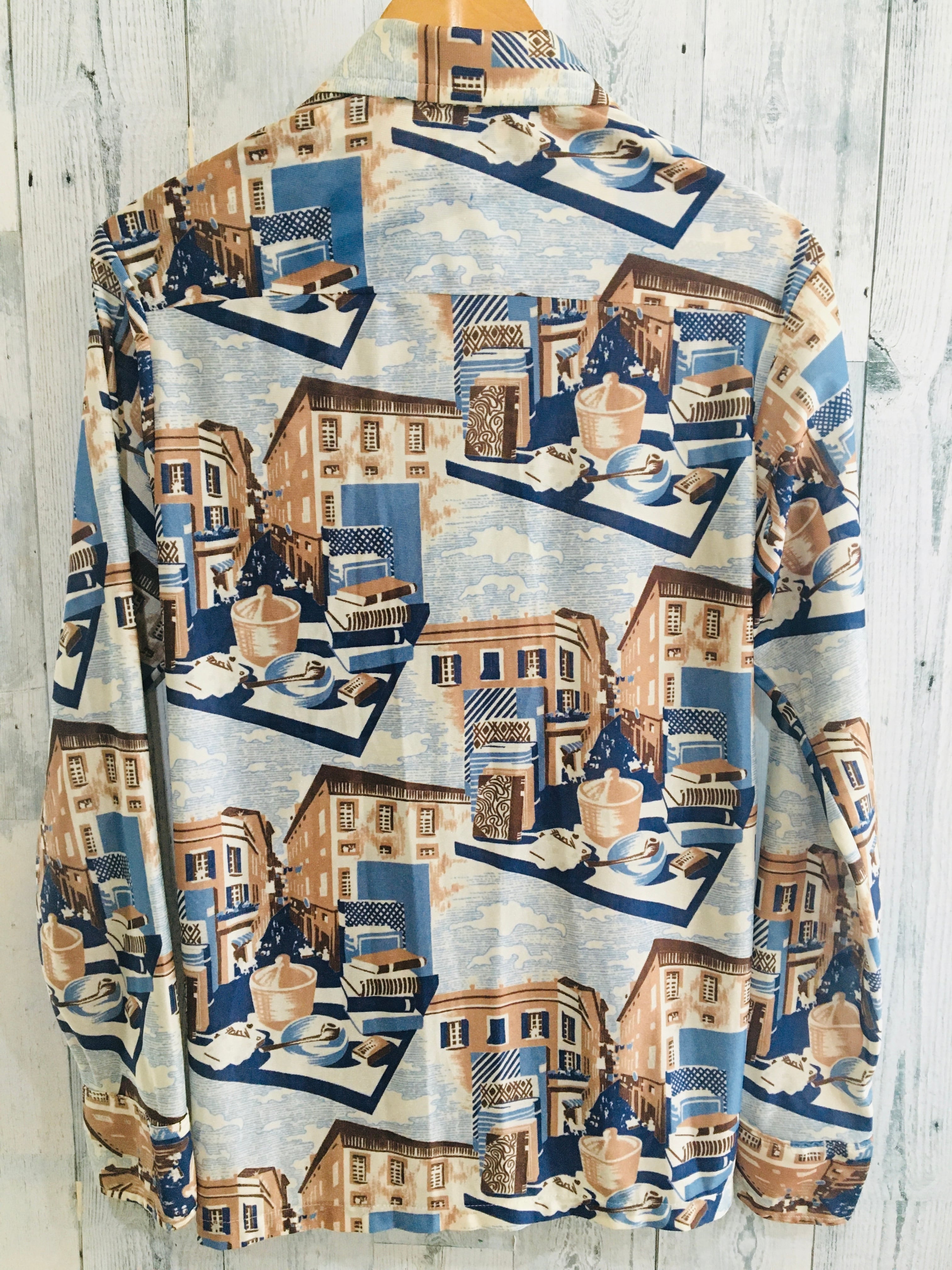 USAビンテージ 柄物ポリシャツ 街 静物画 アート 70s