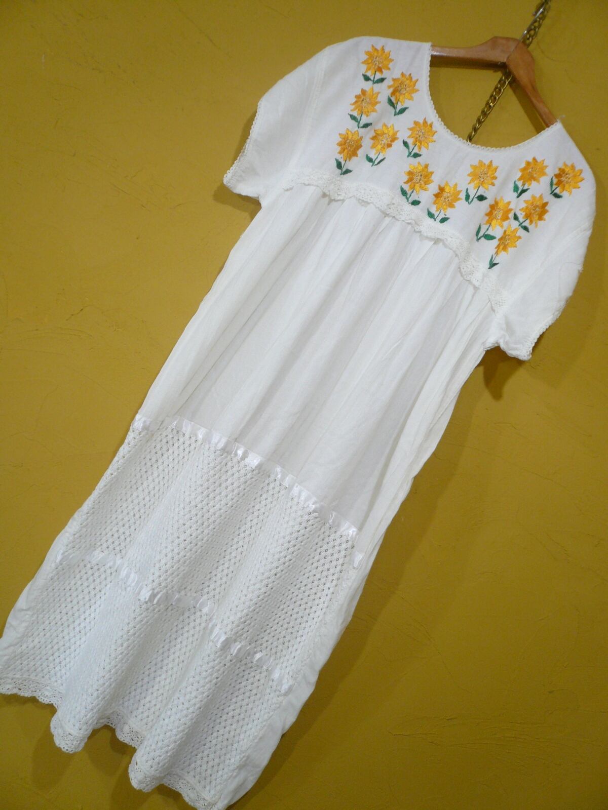 USビンテージ 花刺繍 ワンピース / ひまわり ヒッピー ボヘミアン OLD