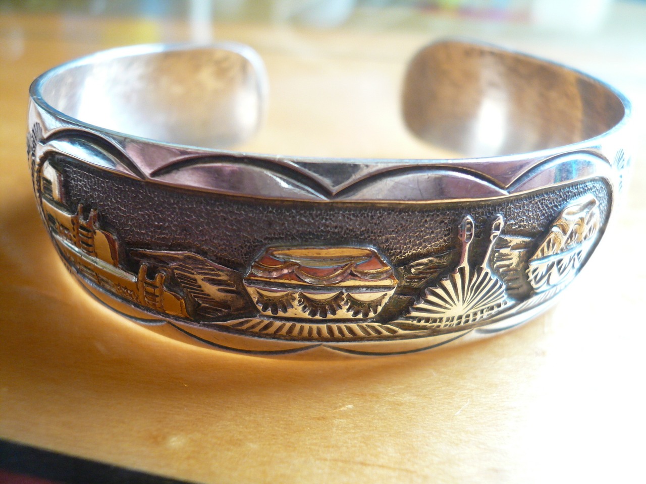 ナバホ インディアンジュエリー ストーリーテラーバングル スターリングシルバー&14K