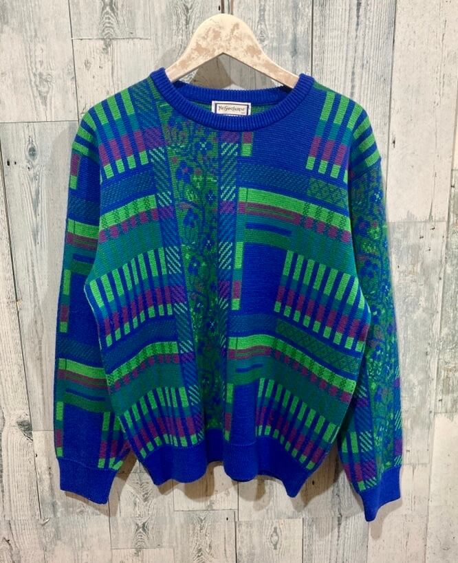 ビンテージ イヴ・サンローラン ブルー グリーン系柄物セーター 90s OLD