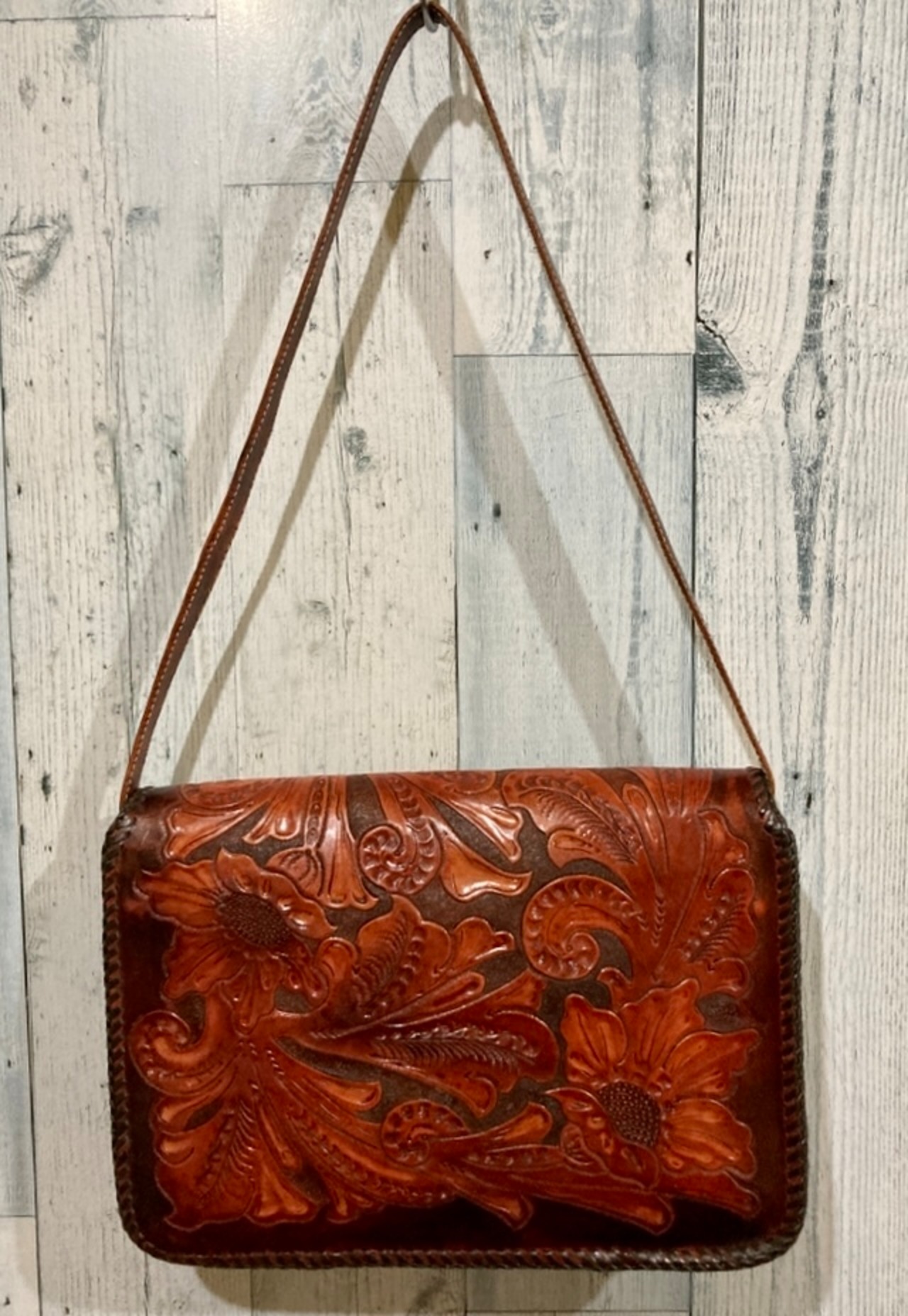 ビンテージ カービングレザーバッグです。
