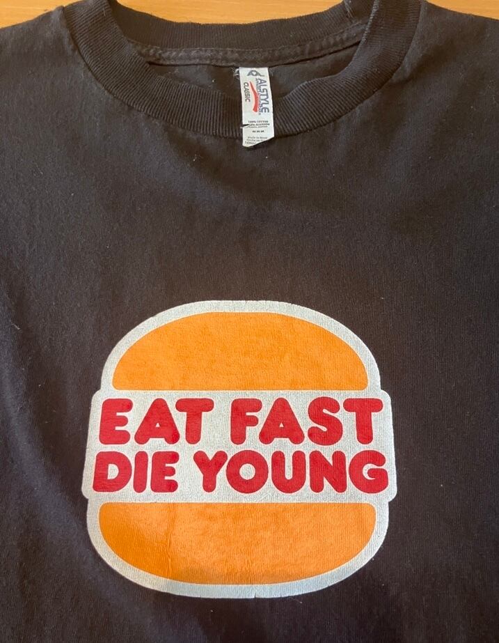 EAT FAST DIE YOUNG 早食いは早死にするよ バーガーキングパロディTシャツ