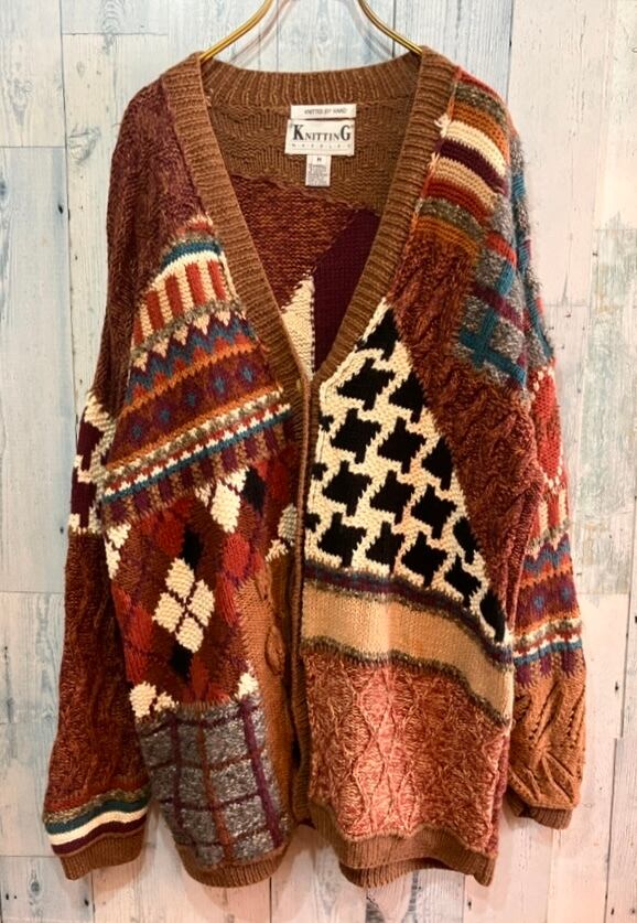 ビンテージ 柄物 コットン×ラミー ハンドニット カーディガン 80s 90s